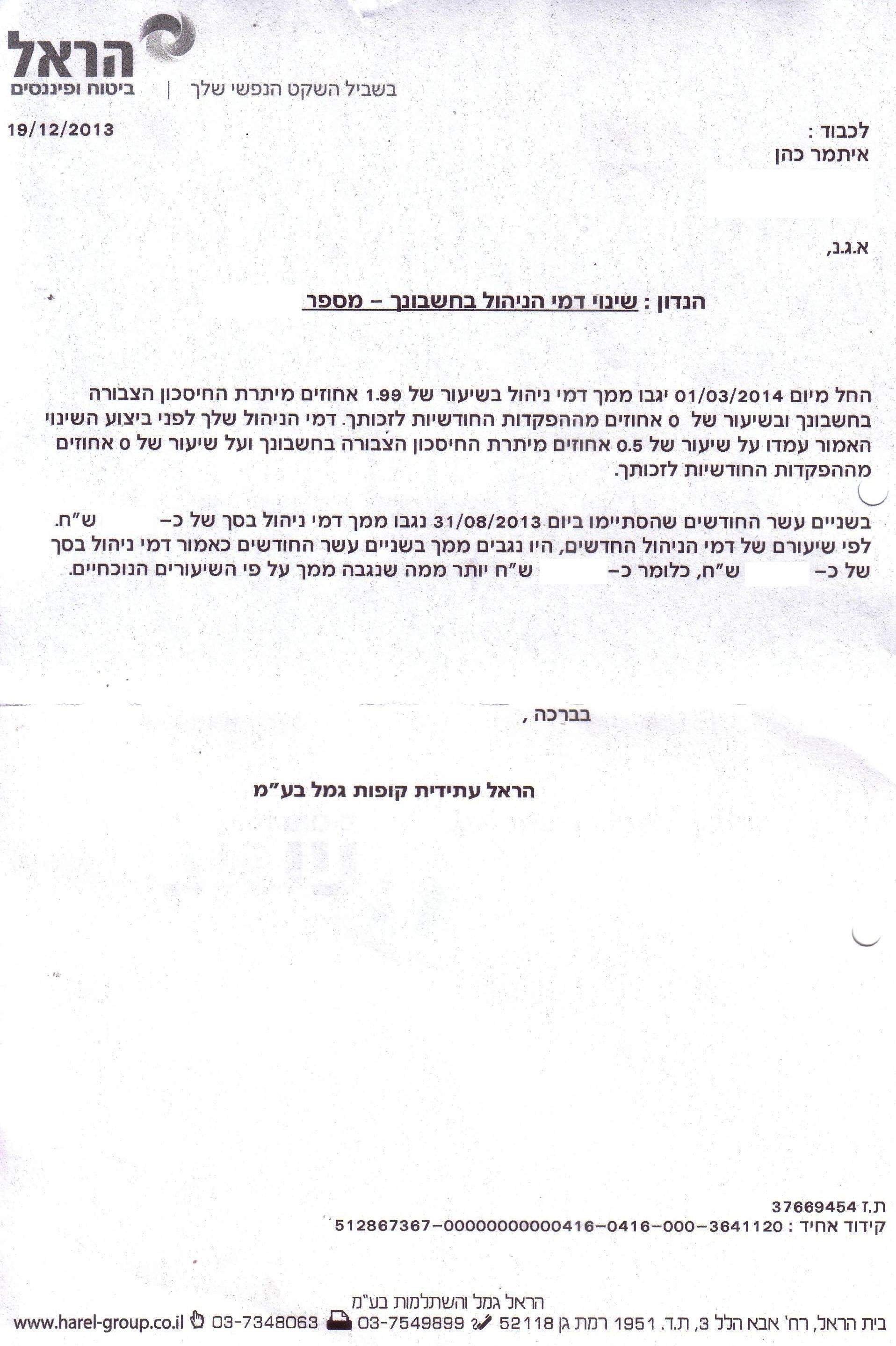 פתאום קם אדם בבוקר, ומגלה שחברת הפנסיה שלו הקפיצה את דמי הניהול בקופת הגמל ובקרן ההשתלמות שלו פי ארבעה. זה מה שקרה לי לאחרונה, כשקיבלתי מכתב שבו, תחת הכותרת הלקונית "שינוי דמי הניהול בחשבונך", הודיעה לי חברת "הראל", שדמי הניהול של קרן ההשתלמות שלי עלו מ-0.5% ל-1.99%. כאילו לא די בקפיצה המטאורית בדמי הניהול – פי ארבעה(!) – ההודעה נשלחה בדיעבד: על פי המכתב, ההעלאה נעשתה ב-30.9.13, בעוד שהתאריך על המכתב הוא 14.11.13. במכתב נפרד שהגיע באותו יום התבשרתי – גם כן בדיעבד – על הקפצת דמי הניהול בקופת הגמל